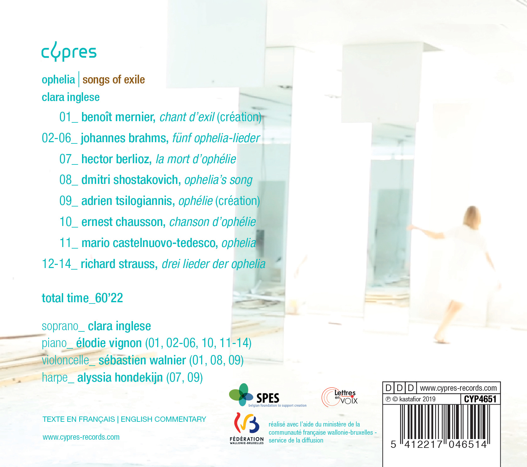 Clara Inglese a vingt ans quand elle découvre la personnalité d’Ophélie, vertigineusement complexe et envoûtante, qui décuple son désir de chanter. Aujourd’hui elle révèle, depuis Shakespeare et dans les tourments de notre XXIe siècle, une Ophélie clairvoyante, vivante et libre. Benoît Mernier lui dédie un poignant « Chant d’exil » sur un texte inédit de François Emmanuel, en écho à la tragédie de l’Ophélie migrante et à la mémoire de nos frères humains morts noyés sur le chemin de l’exil. Adrien Tsilogiannis exalte pour elle les vers d’Arthur Rimbaud, toujours vibrants d’actualité. Ces deux créations de 13 et 15 minutes chacune côtoient les pièces intemporelles de Shostakovich, Strauss, Chausson, Brahms, Castelnuovo-Tedesco et Berlioz. Ophélie fait éclater les miroirs en traversant le temps.