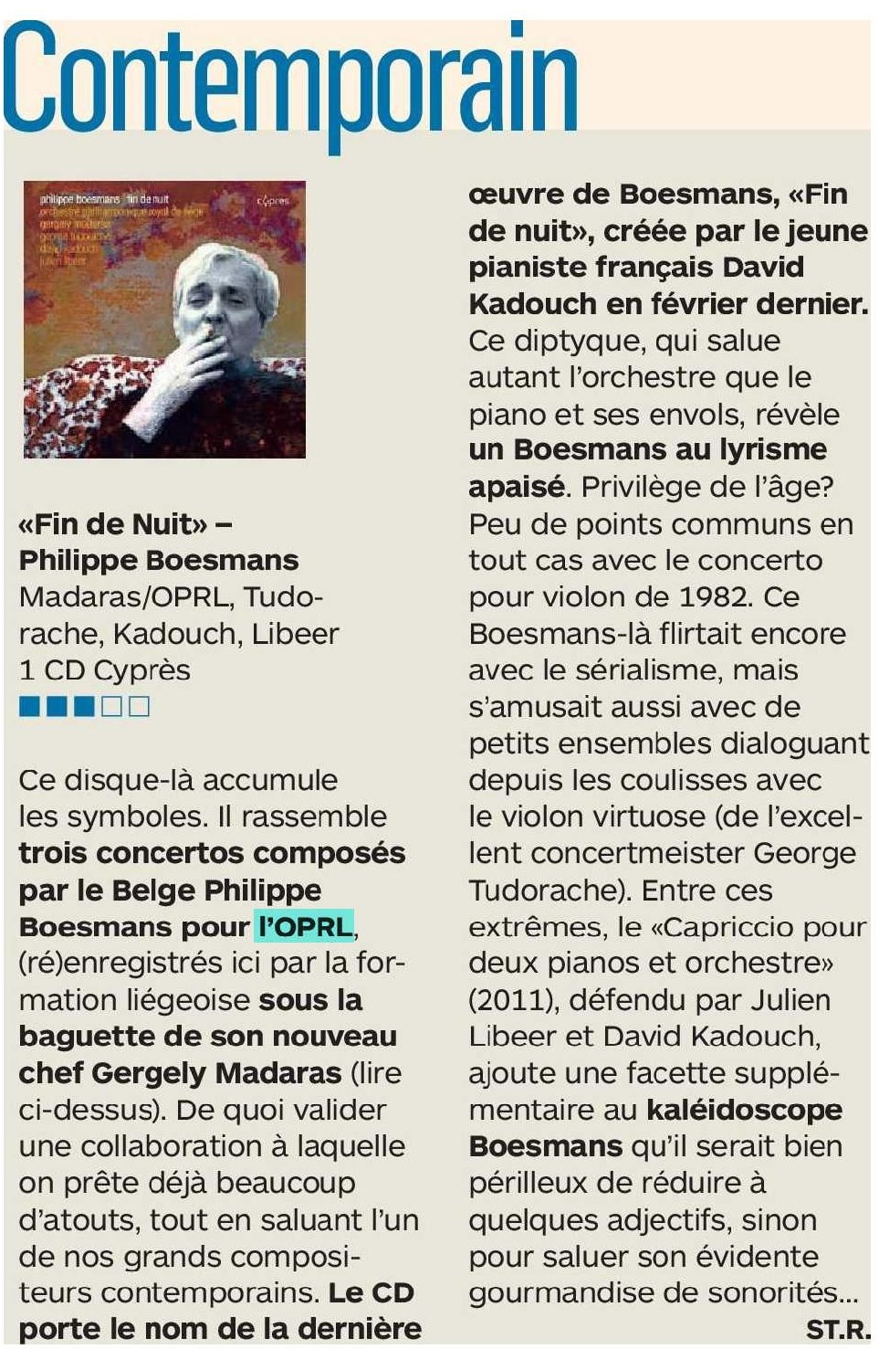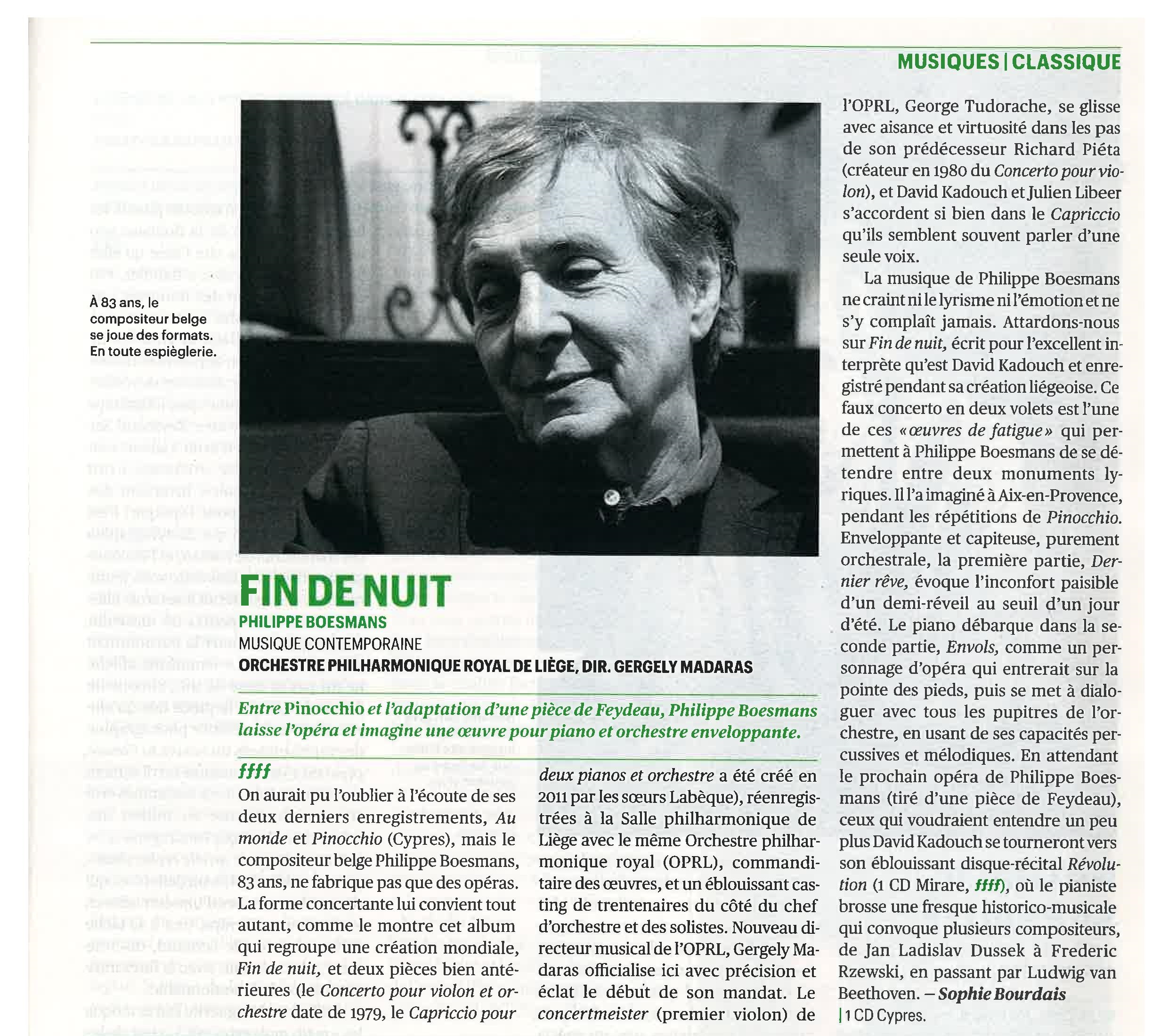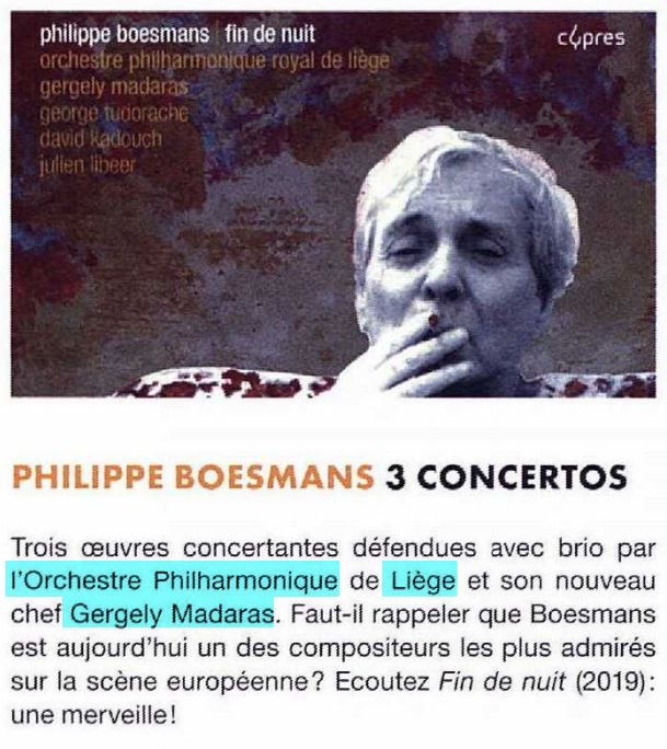 | 18€ « Fin de nuit » convie à une histoire de notes, un foisonnement de notes dédiées à l’orchestre par Philippe Boesmans, ce magicien du son. Les trois pièces de ce CD (Le concerto pour violon, le capriccio pour deux pianos et orchestre et Fin de nuit pour piano et orchestre qui donne son titre à l’album) – toutes commandées par l’Orchestre Royal Philharmonique de Liège – soulignent la solidité du lien entre un compositeur et un orchestre. Cet album sort à l’occasion de la prise de fonction de Gergely Madaras à la Direction musicale de l’orchestre, comme un jour neuf qui commence. Écouter en streaming : https://orcd.co/pgled6o |