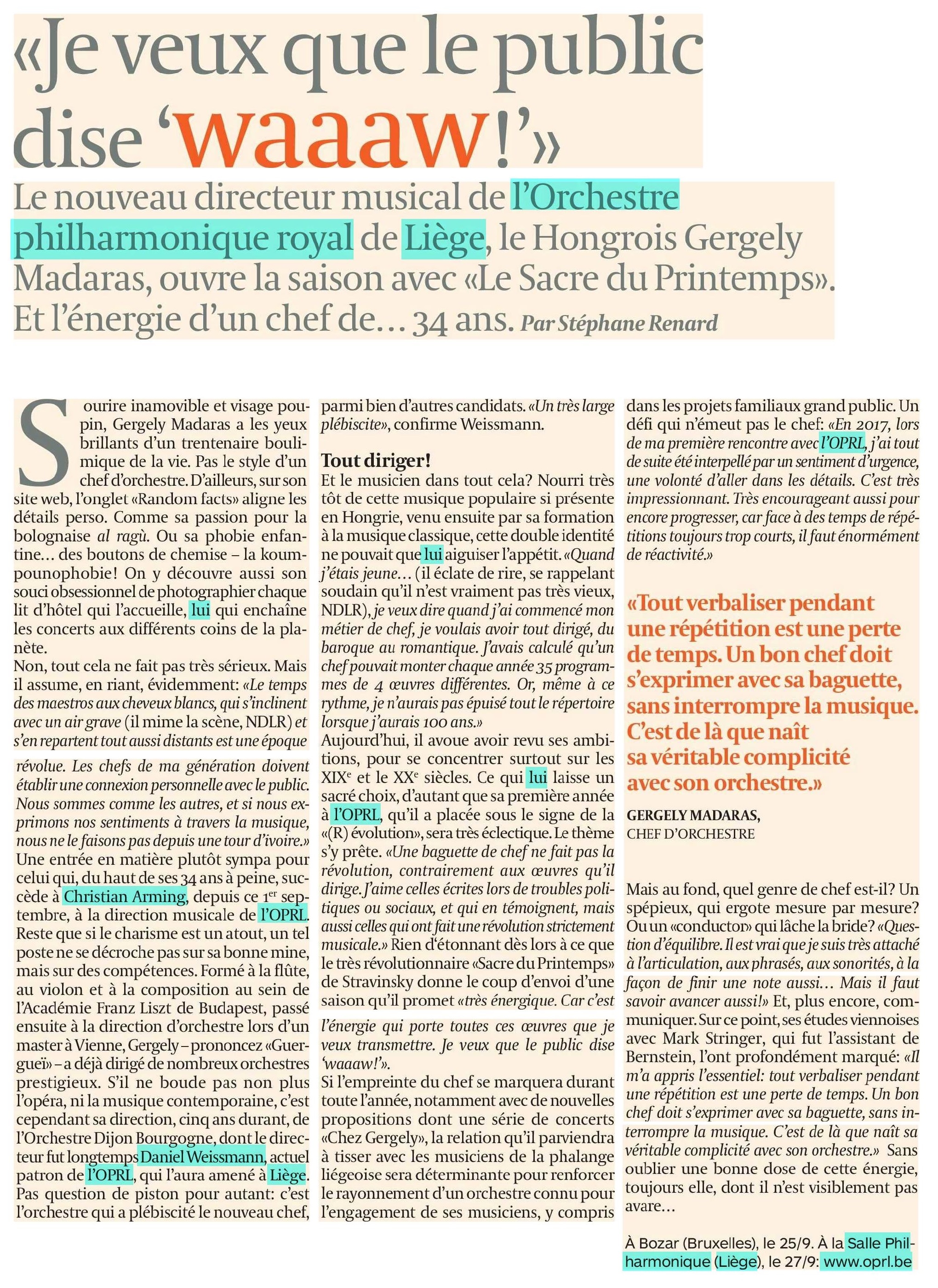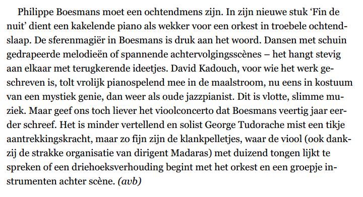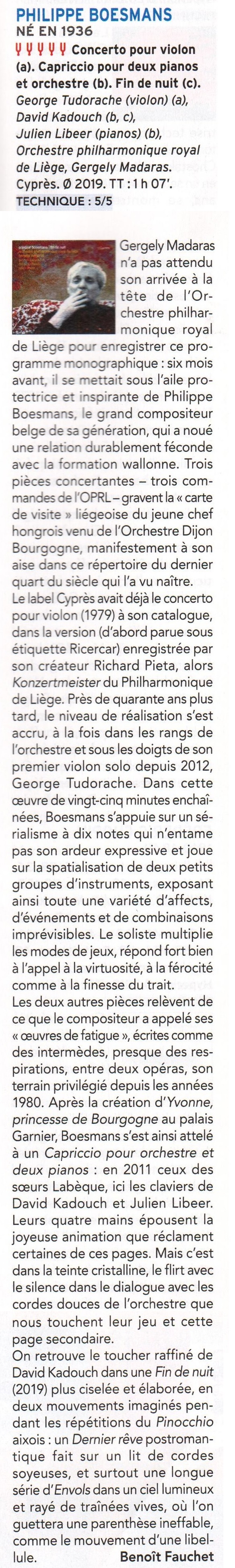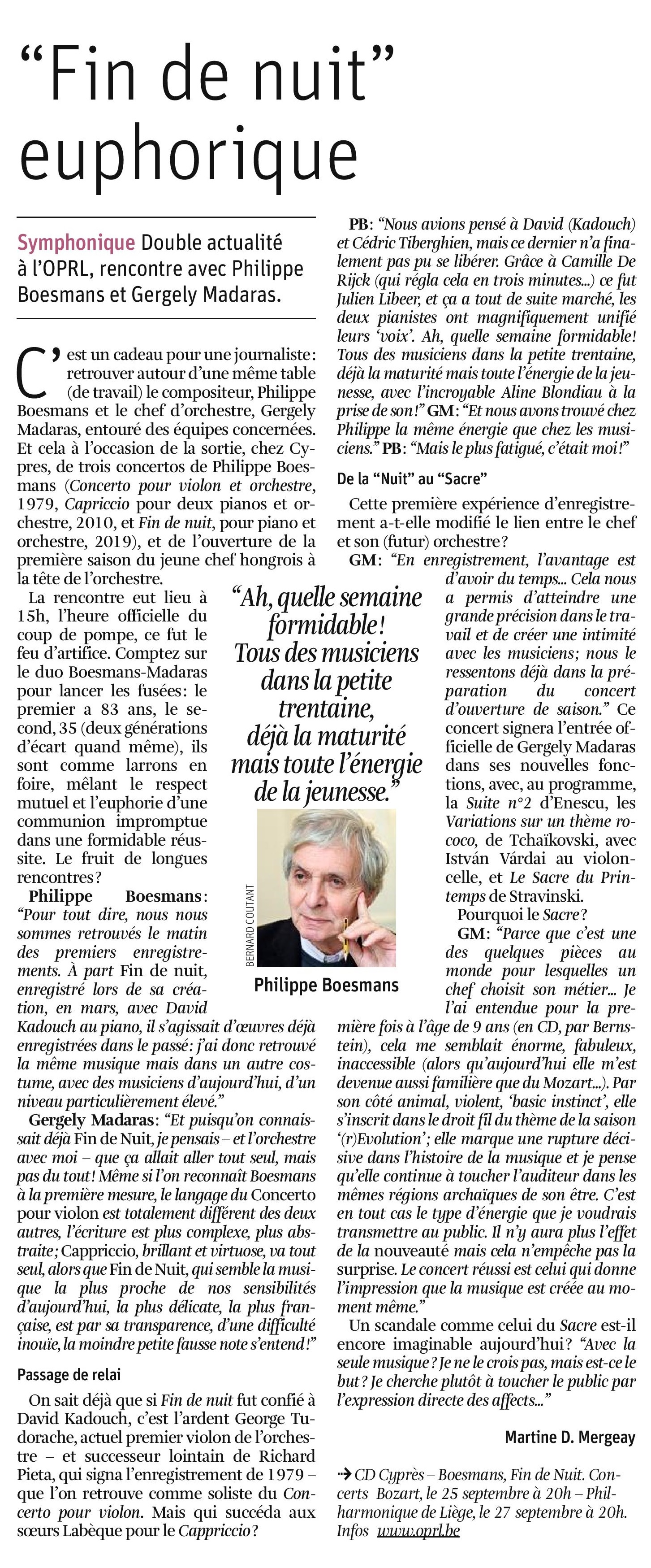| 18€ « Fin de nuit » convie à une histoire de notes, un foisonnement de notes dédiées à l’orchestre par Philippe Boesmans, ce magicien du son. Les trois pièces de ce CD (Le concerto pour violon, le capriccio pour deux pianos et orchestre et Fin de nuit pour piano et orchestre qui donne son titre à l’album) – toutes commandées par l’Orchestre Royal Philharmonique de Liège – soulignent la solidité du lien entre un compositeur et un orchestre. Cet album sort à l’occasion de la prise de fonction de Gergely Madaras à la Direction musicale de l’orchestre, comme un jour neuf qui commence. Écouter en streaming : https://orcd.co/pgled6o |