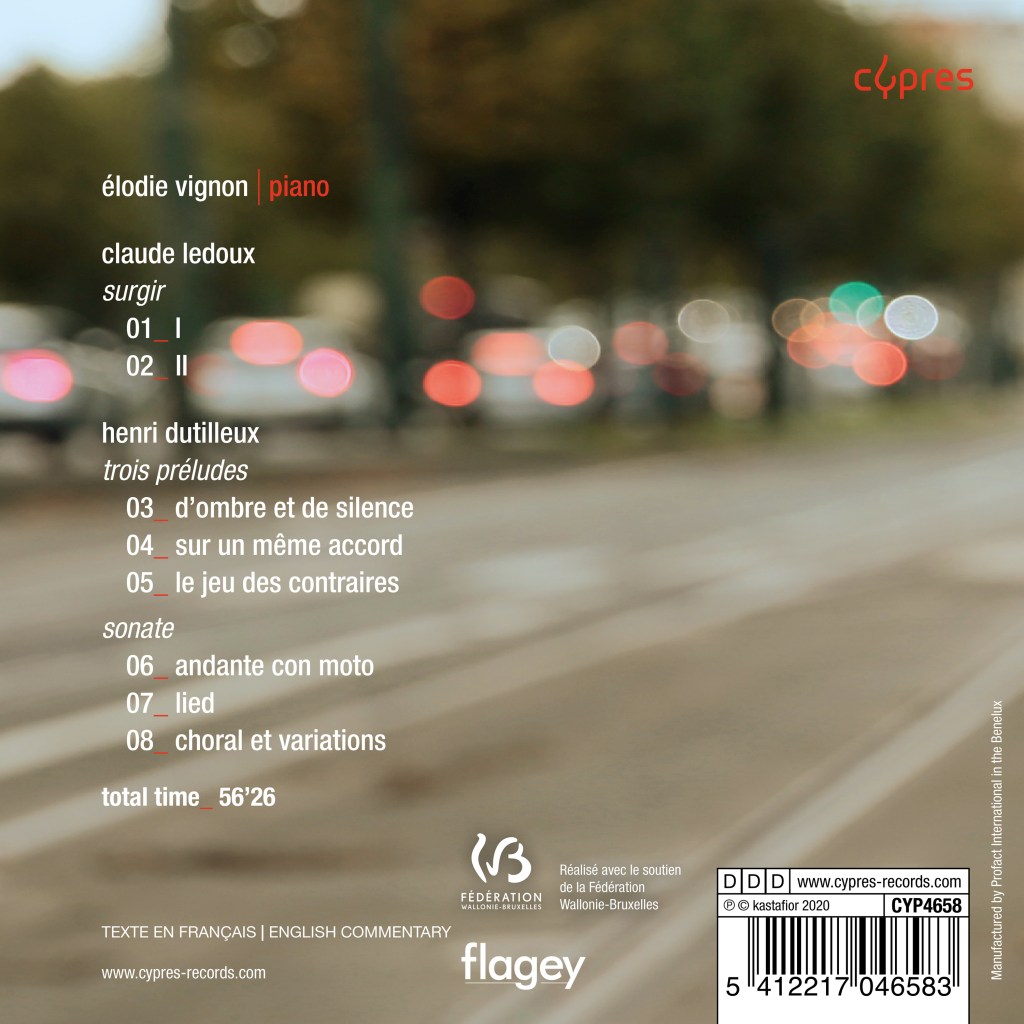 FR | D’ombres… Ce programme s’inscrit dans la continuité du premier disque consacré aux Études de Debussy (CYP1678). Cet enregistrement révéla la pianiste Elodie Vignon auprès du public. Dutilleux entretient avec Debussy un lien étroit au niveau de son approche sensorielle de la musique. Composée juste après la seconde guerre mondiale, sa Sonate pour piano nous rappelle, sous certains aspects, Pour le piano de Claude Debussy, également composé au lendemain d’une autre Grande guerre. La composition des Trois préludes, s’étalant sur une quinzaine d’années, témoigne du désir du compositeur de faire évoluer son style et sa syntaxe, en la rendant moins linéaire et traditionnelle. Claude Ledoux surgit de l’ombre et nous livre une œuvre désireuse de traduire le monde dans lequel nous vivons, un monde de silence et de surgissements sonores en perpétuelle transformation.