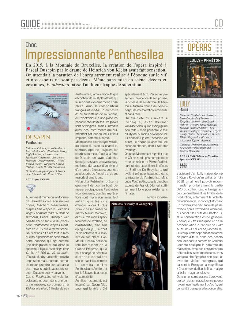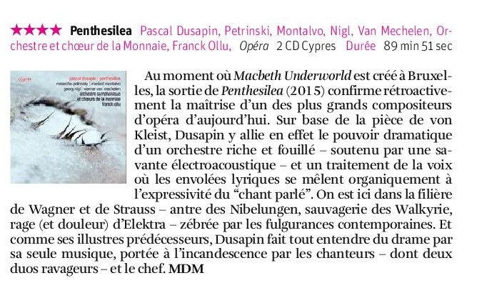 Pascal Dusapin doit être un homme comblé. Alors que l’on crée son Macbeth Underworld en ce moment à Bruxelles, c’est l’enregistrement de son précédent ouvrage lyrique qui vient de sortir de chez le label belge Cypres. Penthesilea était également une aventure bruxelloise, puisqu’il s’agit ici de l’enregistrement de la première production, à la Monnaie en 2015.