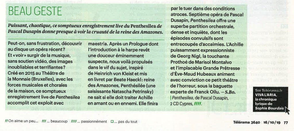 Pascal Dusapin s’est confié à l’annonce de cette récompense : « Je suis très heureux et honoré de recevoir cette distinction du International Classical Music Awards pour l’enregistrement de mon opéra Penthesilea. Cet opéra pour le moins tragique semble être accompagné par des fées tant il m’a apporté de joies. Tout d’abord parce qu’il fut commandé et crée à La Monnaie de Bruxelles, ma maison d’opéra de cœur mais aussi parce qu’il a été édité par la magnifique compagnie de disques Cypres, dont on sait l’engagement et l’enthousiasme aux productions contemporaines. Tous les artistes de cette aventure lyrique, Natasha Petrinsly, Georges Nigl, Marisol Montalvo, Werner van Mechelen, Eve Maud Marie Hubeaux, Thierry Coduys, le chœur et l’orchestre symphonique de La Monnaie conduit par Franck Ollu ont été absolument magnifiques de dévouement et de talents. Je remercie du fond du cœur les membres du jury pour ce trophée prestigieux. En ces temps où nous partageons toutes et tous une grande inquiétude, il est bon de recevoir un aussi beau signe d’espoir.”
