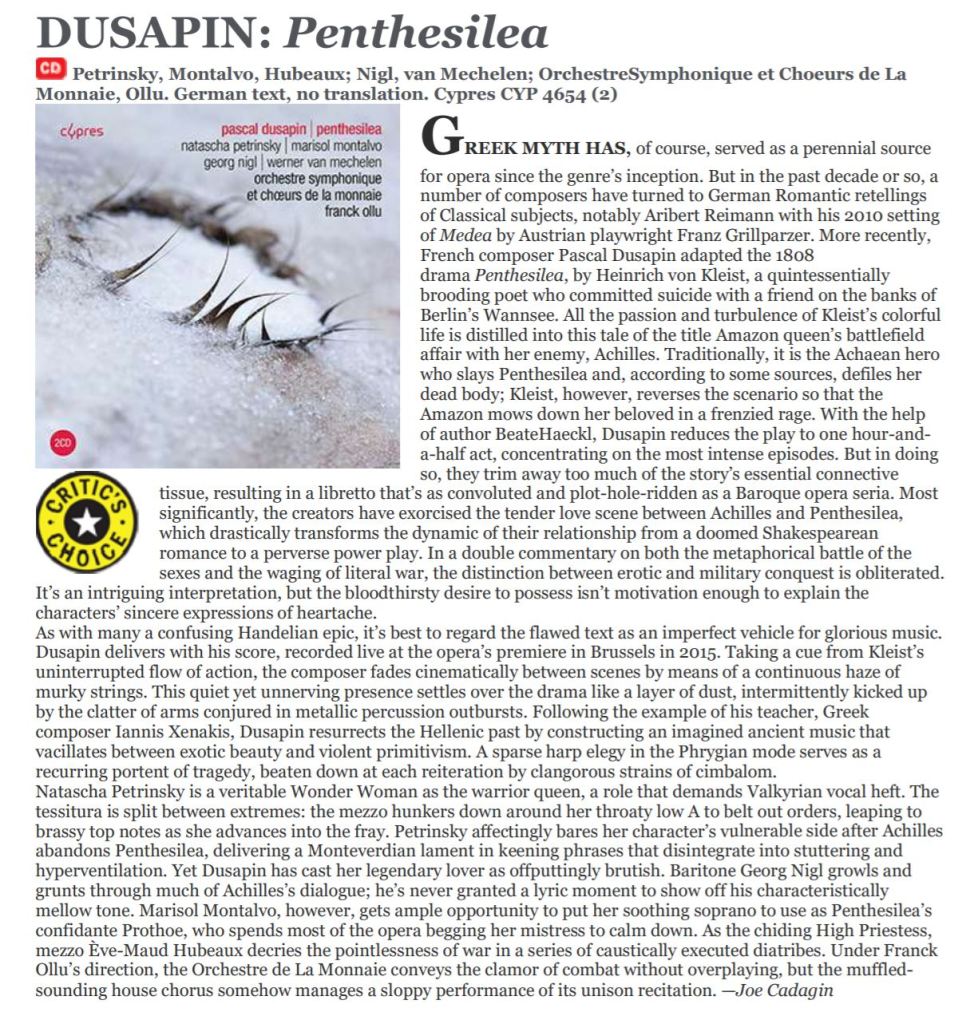 The recording from the Monnaie performances is wonderfully clear and spacious. Every detail of the orchestral writing, with the electronics that Duspain uses very sparingly, registers under Franck Ollu; the solo performances – Natascha Petrinsky a suitably histrionic Penthesilea, Georg Nigl a slightly thuggish Achilles, and Werner Van Mechelen a plausible Achilles – are mostly outstanding; only Marisol Montalvo’s rather hit-and-miss German as Prothoe jars occasionally. But this is a lingeringly powerful piece of music theatre, no doubt of it.