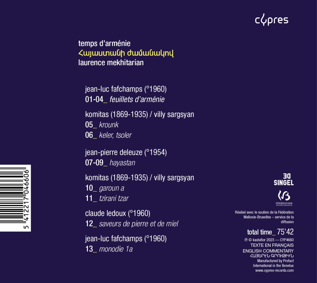 EN | This Temps d’Arménie is the musical result of close collaborations initiated by the pianist Laurence Mekhitarian with the three Belgian composers Jean-Pierre Deleuze, Jean-Luc Fafchamps and Claude Ledoux. The unpublished works on this disc are the result of a musical and cultural journey experienced by their authors during multiple trips to Armenia.