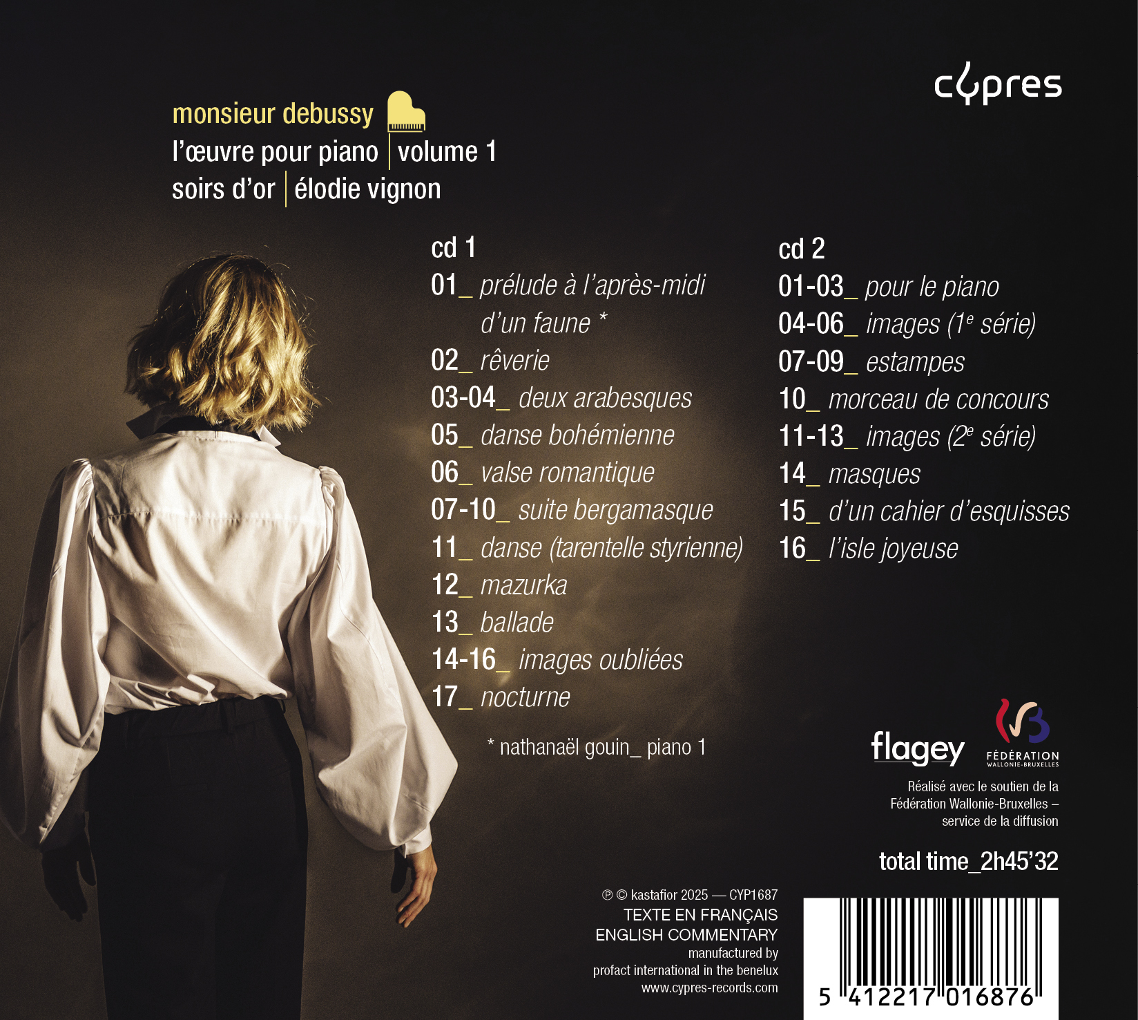 FR | Pour Élodie Vignon, le choix d’enregistrer une intégrale chronologique des œuvres pour piano de Debussy naquit de ce que le Prélude à l’après-midi d’un faune fut à l’époque de Debussy : une révélation ! Pour elle, jouer cette musique, c’est comme entrer dans un cocon qui n’appartient qu’à soi.