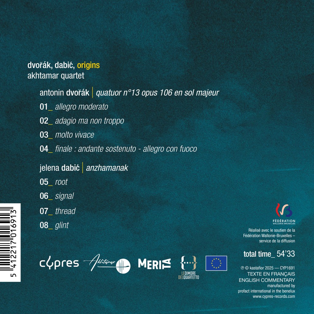 This is an essential recording for chamber music lovers. It celebrates both the romantic heritage, embodied by Dvořák’s mature style, and the opening up to a new generation of female composers. With Anzhamanak by Jelena Dabić, this contemporary piece offers a unique sound experience with original timbres and reveals the full expressive power of the Akhtamar Quartet.